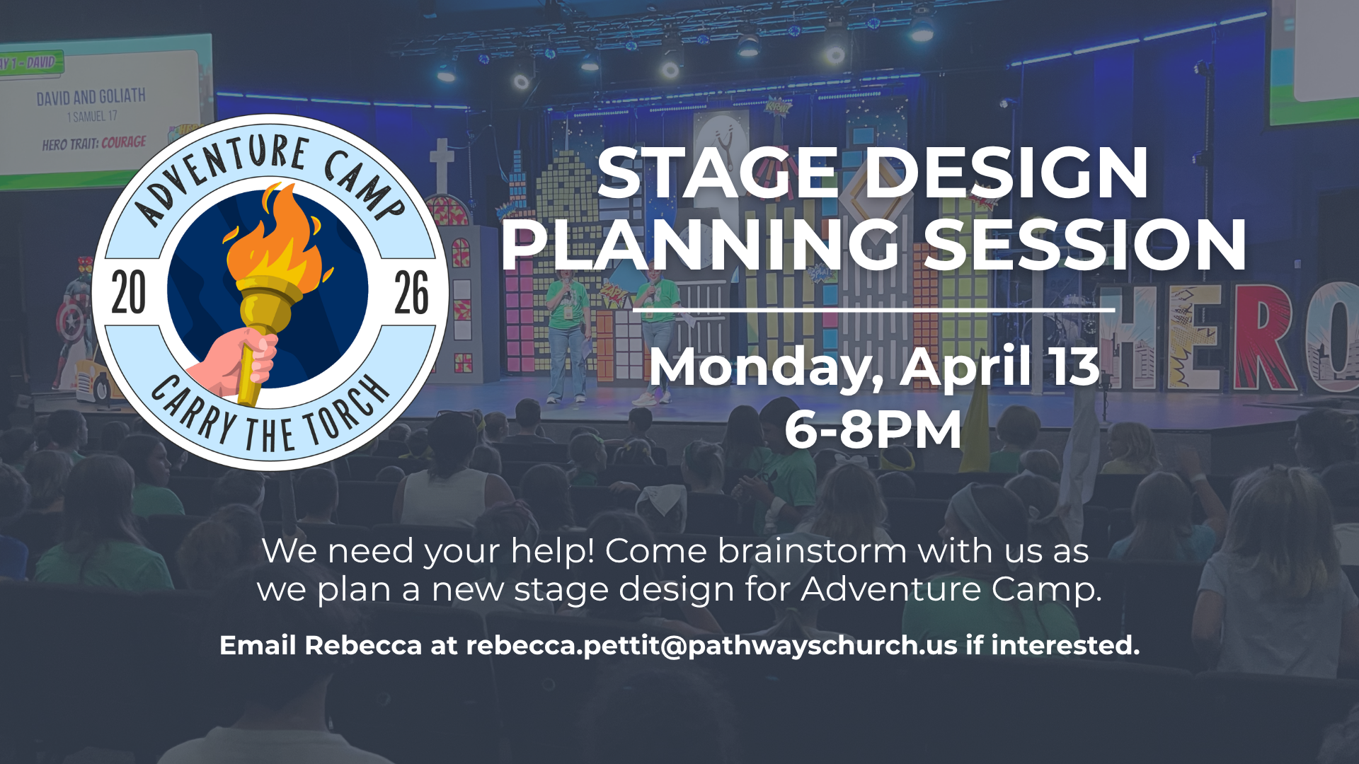 If so, join us for a brainstorm session on Monday April 13, from 6-8PM as we dream about our stage design for Adventure Camp 2026!