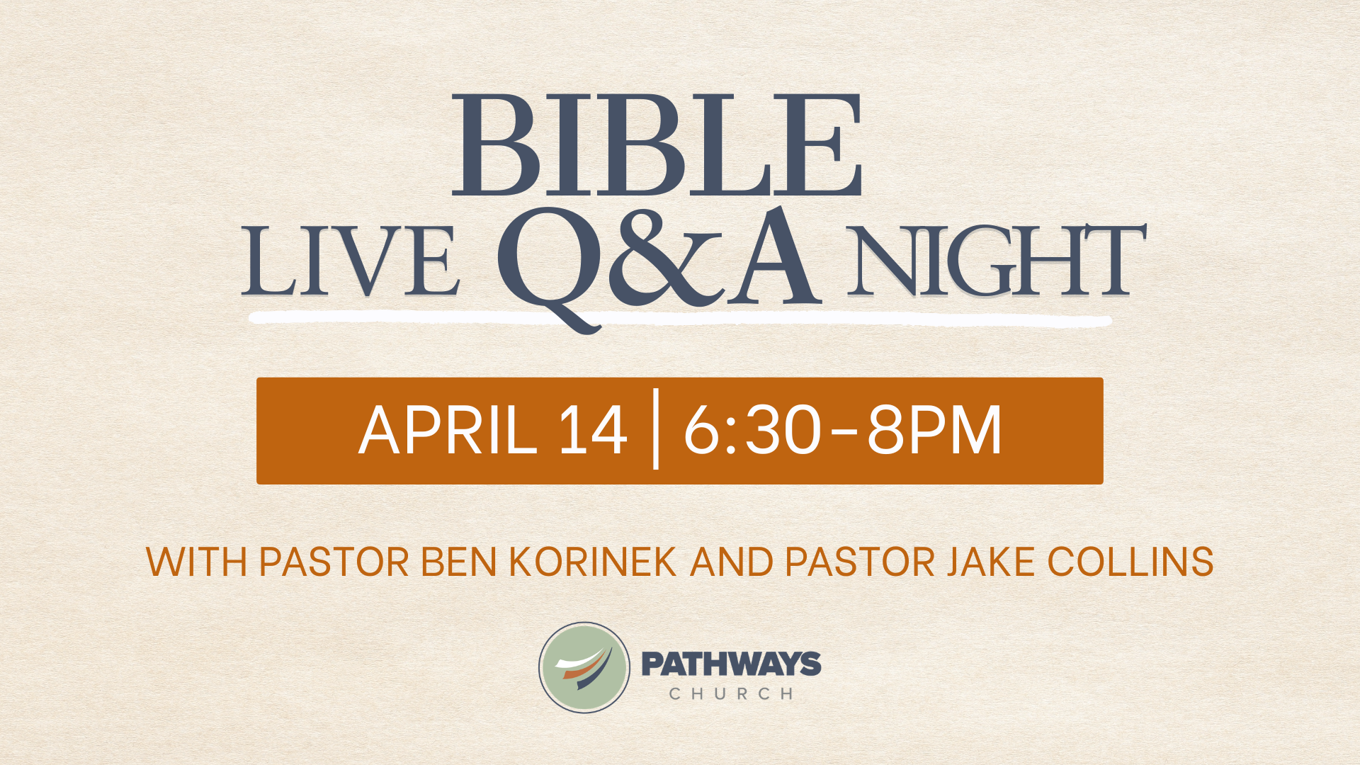 We invite you to our Bible Q&A Night on April 14 from 6:30–8PM, hosted by Pastor Ben Korinek and Pastor Jake Collins.