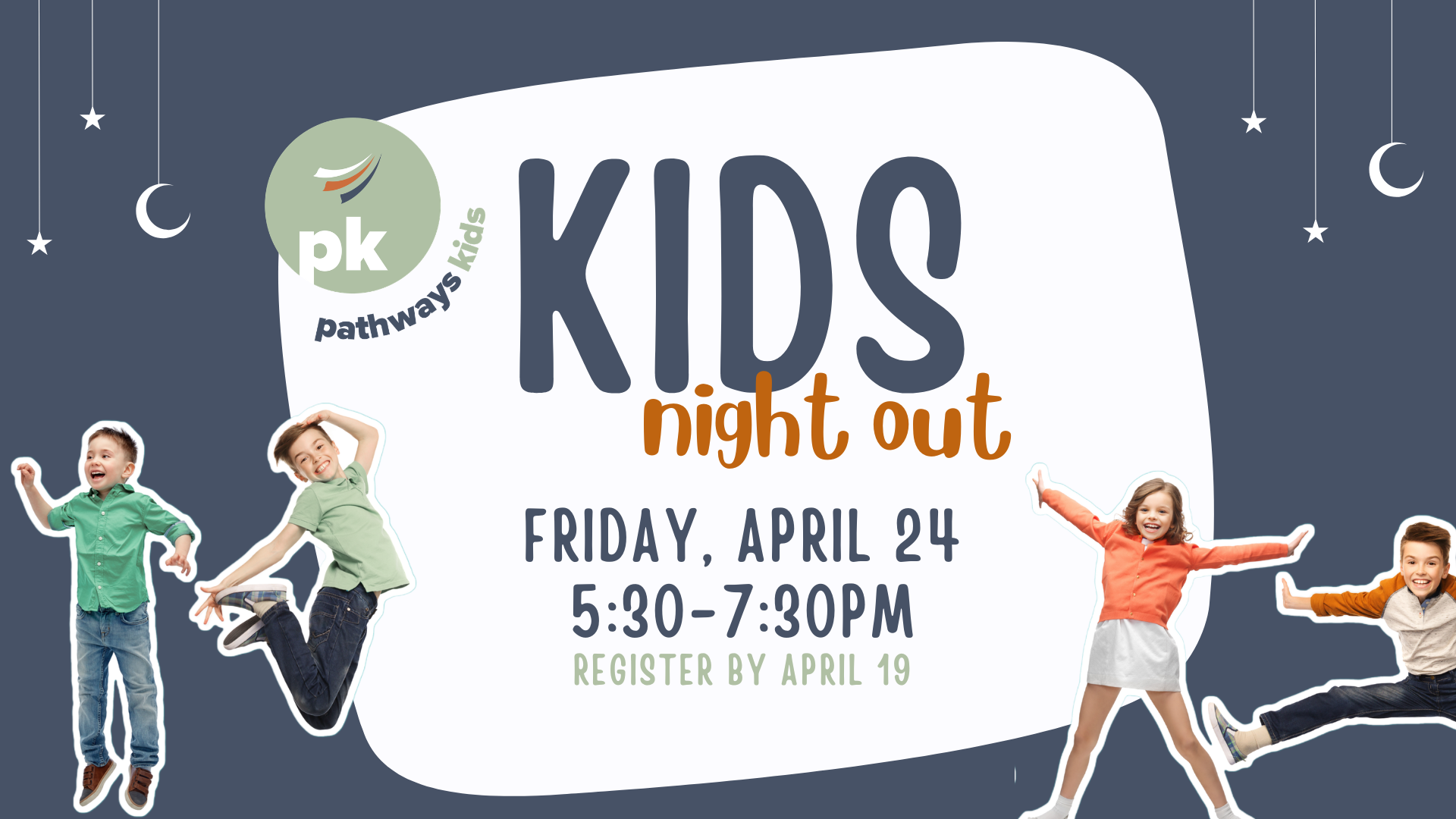 Whatever you need, bring your child, ages 3 through grade 5, to Kid’s Night Out at Pathways Church on Friday, April 24 from 5:30-7:30PM.
