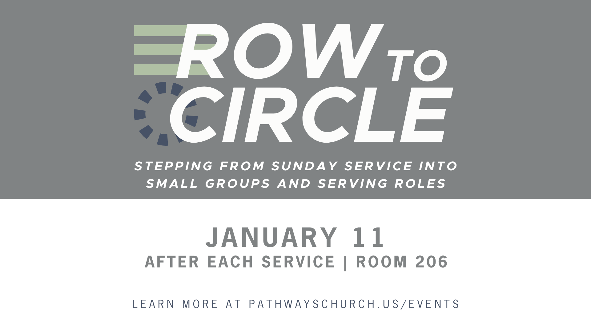 Following both services on Sunday, January 11, there will be a gathering in room 206 to help you know how to step out of the ROW (our Sunday morning services) and into a CIRCLE (a smaller group of people to connect with).