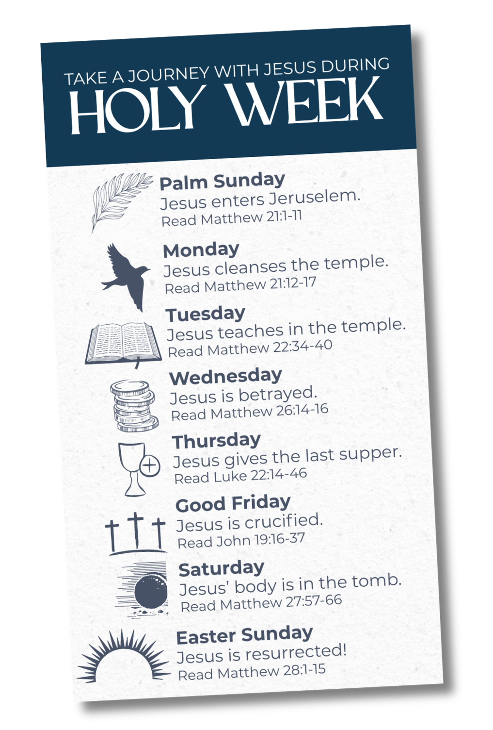 Each day gives you scripture to read as we follow along with the events that took place from Palm Sunday when Jesus rides into Jerusalem, through His teachings, betrayal, crucifixion — ending with His resurrection that we celebrate on Easter Sunday. We hope you’ll fill yourself with these scriptures as you fill yourself with the Word this week!